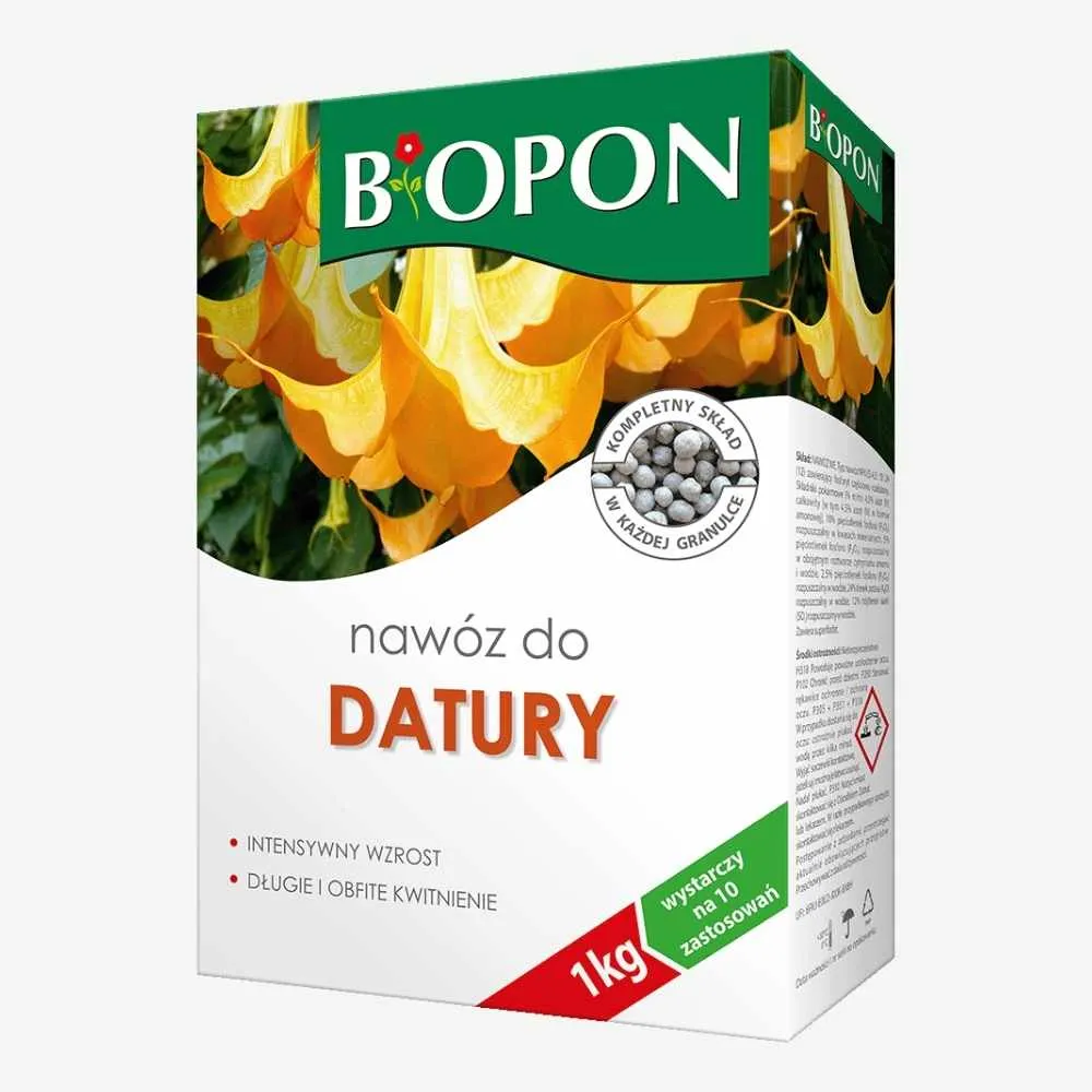 Biopon nawóz do datury 1 kg – granulowany, wspiera intensywny wzrost oraz długie i obfite kwitnienie, wystarcza na 10 zastosowań.Nawóz do datury Biopon 1 kg