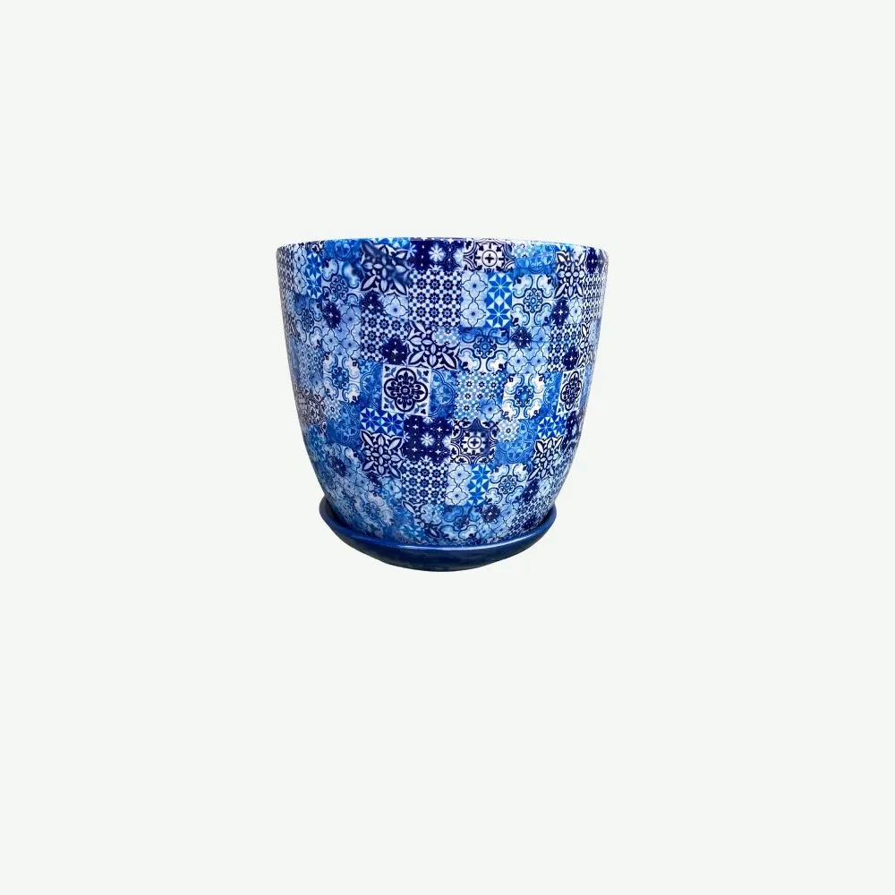 Design inspirowany tradycją Doniczka wyróżnia się bogatym wzornictwem, które przypomina malowane ręcznie portugalskie płytki azulejo. Połączenie różnorodnych, drobnych motywów w intensywnych odcieniach błękitu i bieli tworzy harmonijną i przyciągającą wzrok kompozycję. To idealny element dekoracyjny dla wnętrz w stylu śródziemnomorskim, boho, a także nowoczesnym, które potrzebują kolorowego akcentu.